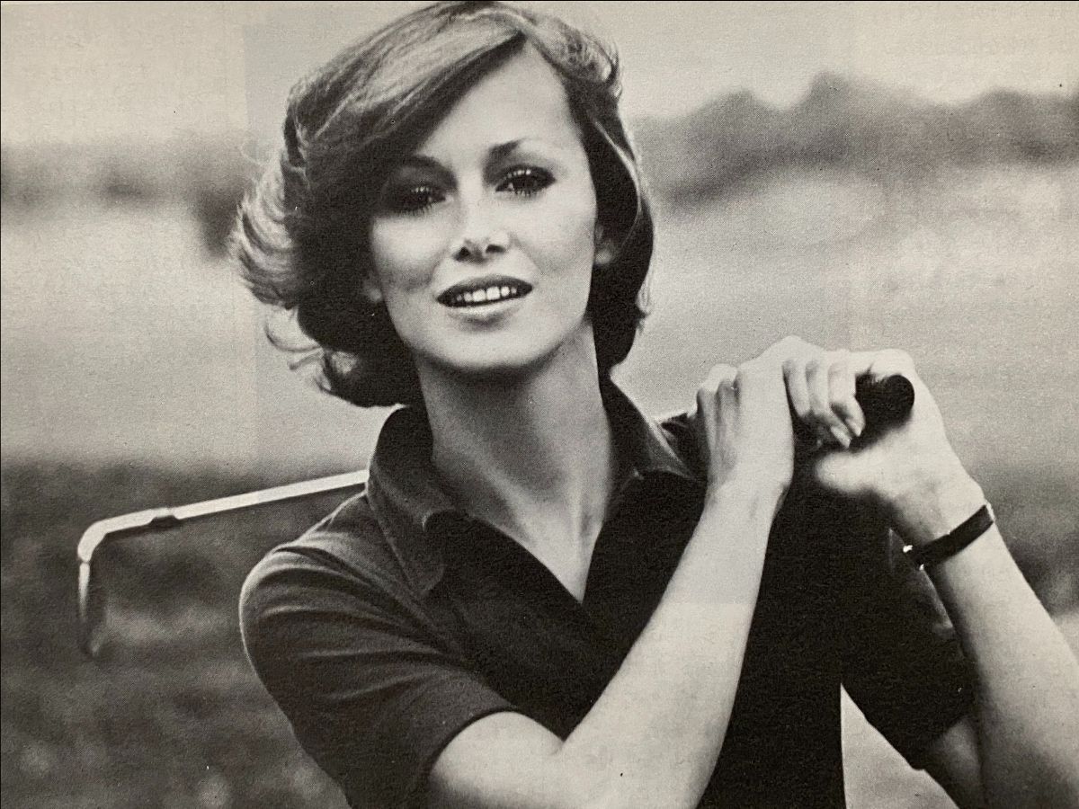 1970's supermodel Karen Graham is profiled in riding gear except for this horses for courses golfing photo...